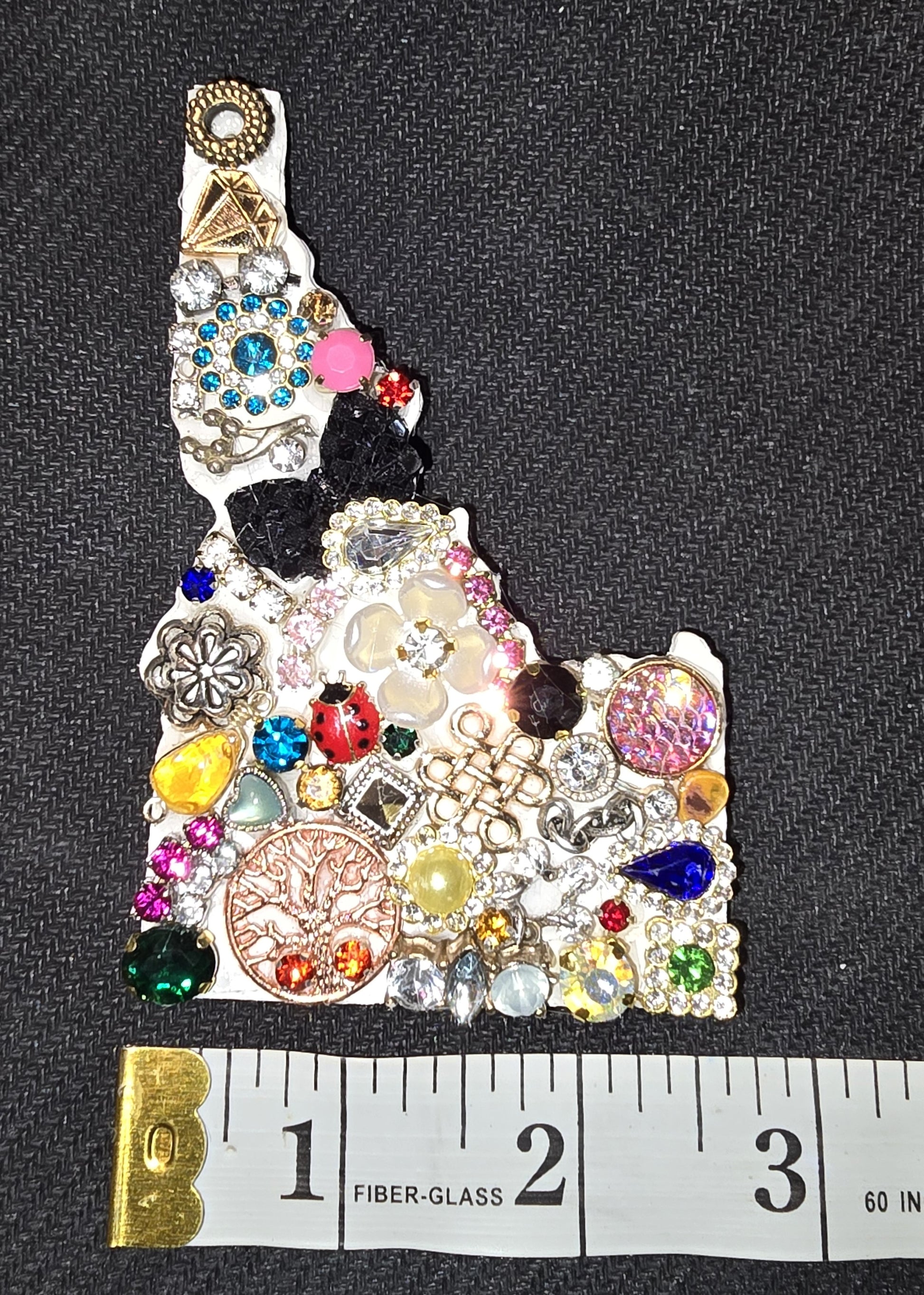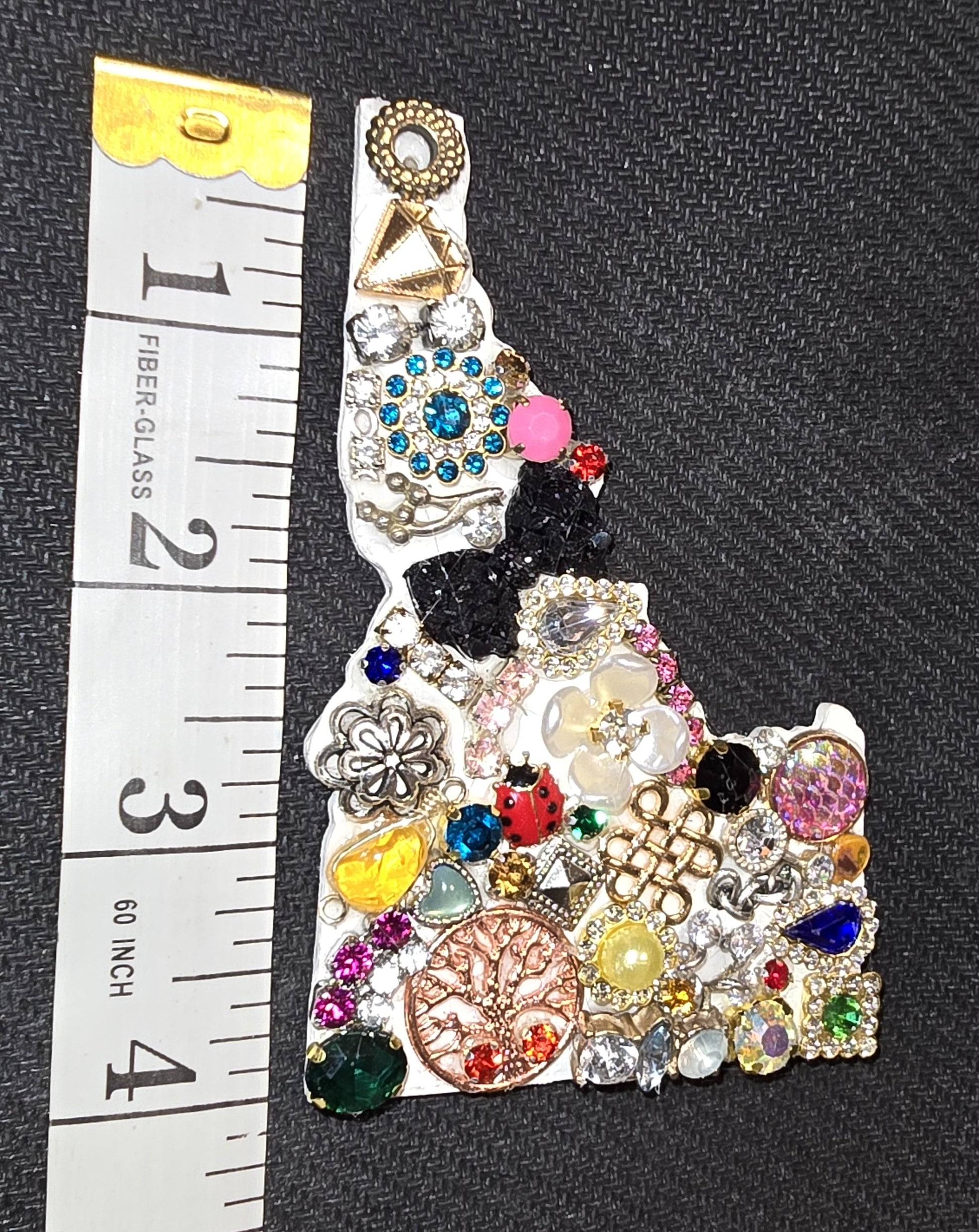 Handcrafted 4 Inch tall decorated State of Idaho wooden ornament from recycled Materials. Jewelry is recycled from other projects to keep from the landfill. My way of recycling.