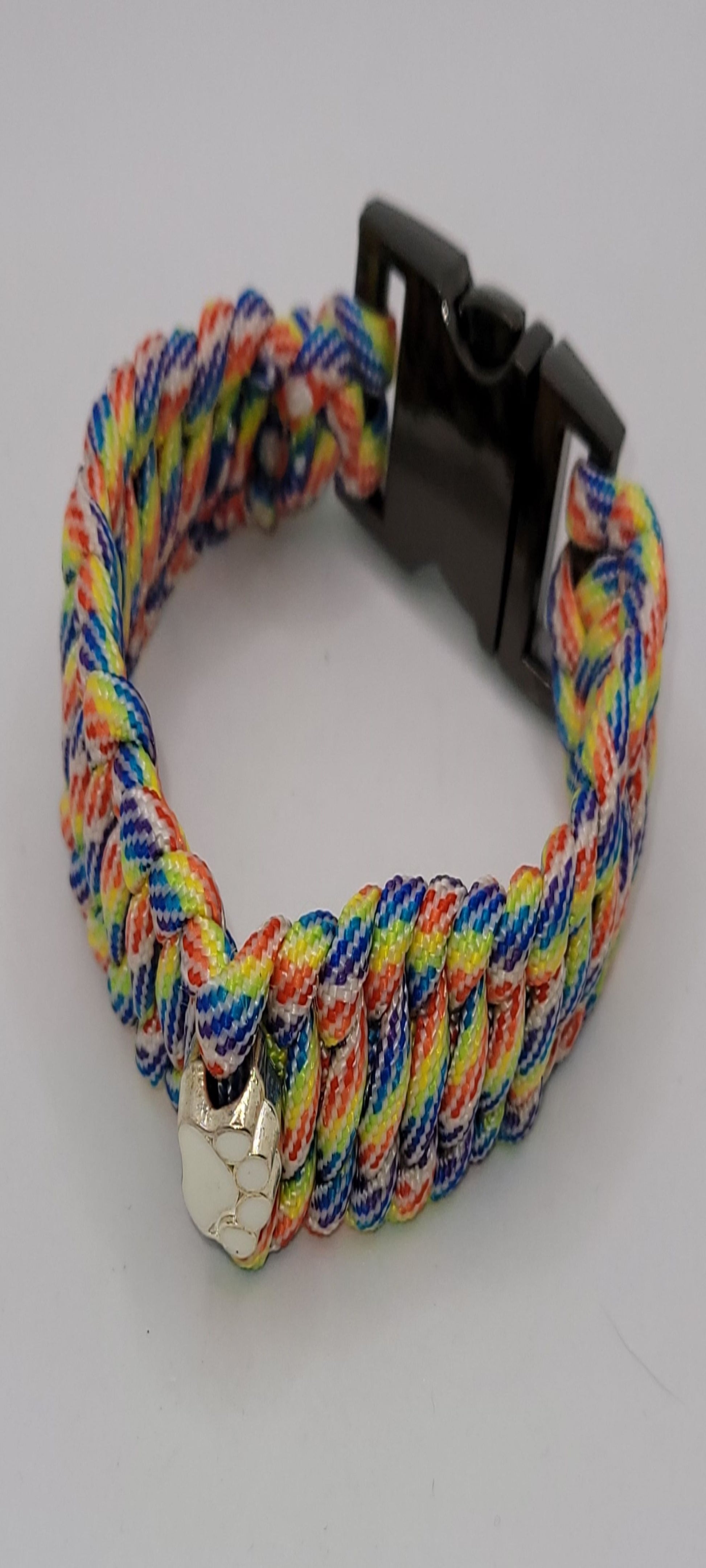 The Rainbow paracord bracelet has a bead. This beautiful bead is White and shows an animal paw. The bracelet has a black buckle. It is 9 inches long. Perfect for an animal lover. Great for animal remembrance who's gone over the rainbow bridge.