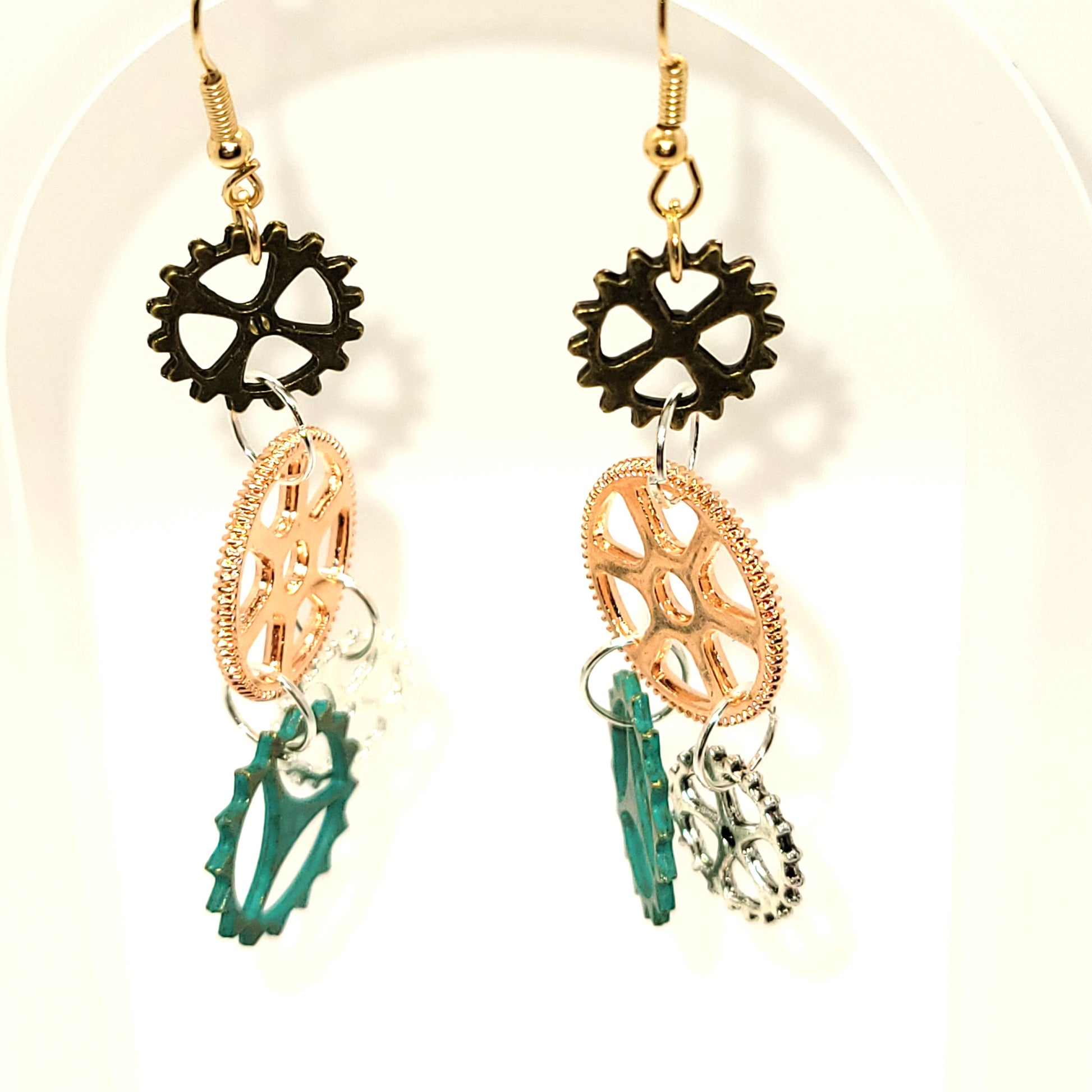 Handcrafted 2 inch steampunk gears 4 colors dangle earring, 2 inches dangle length.
