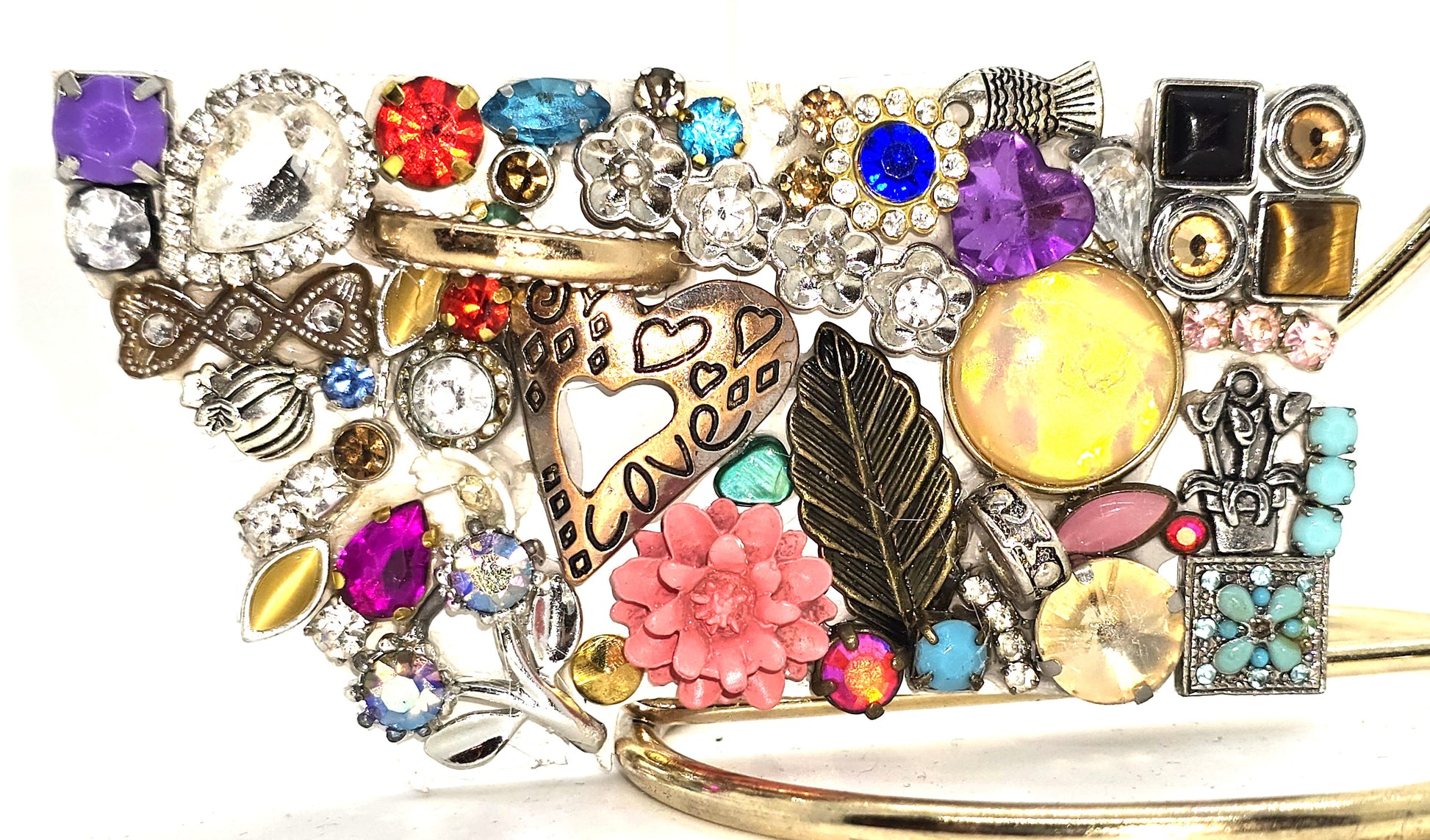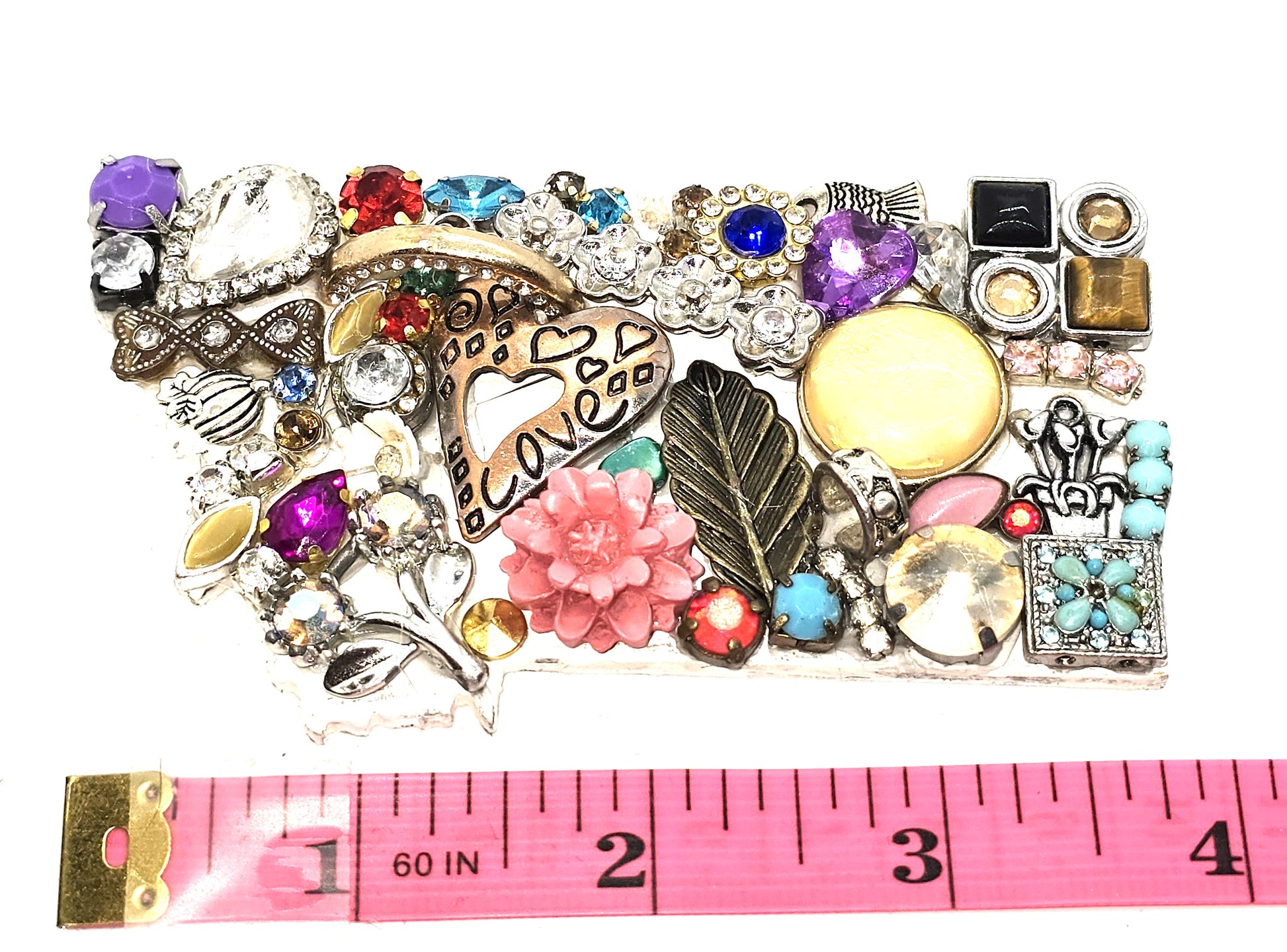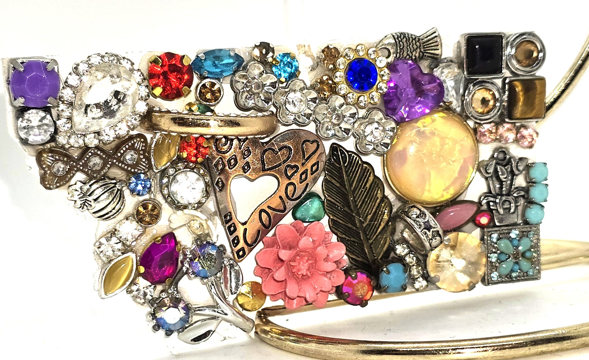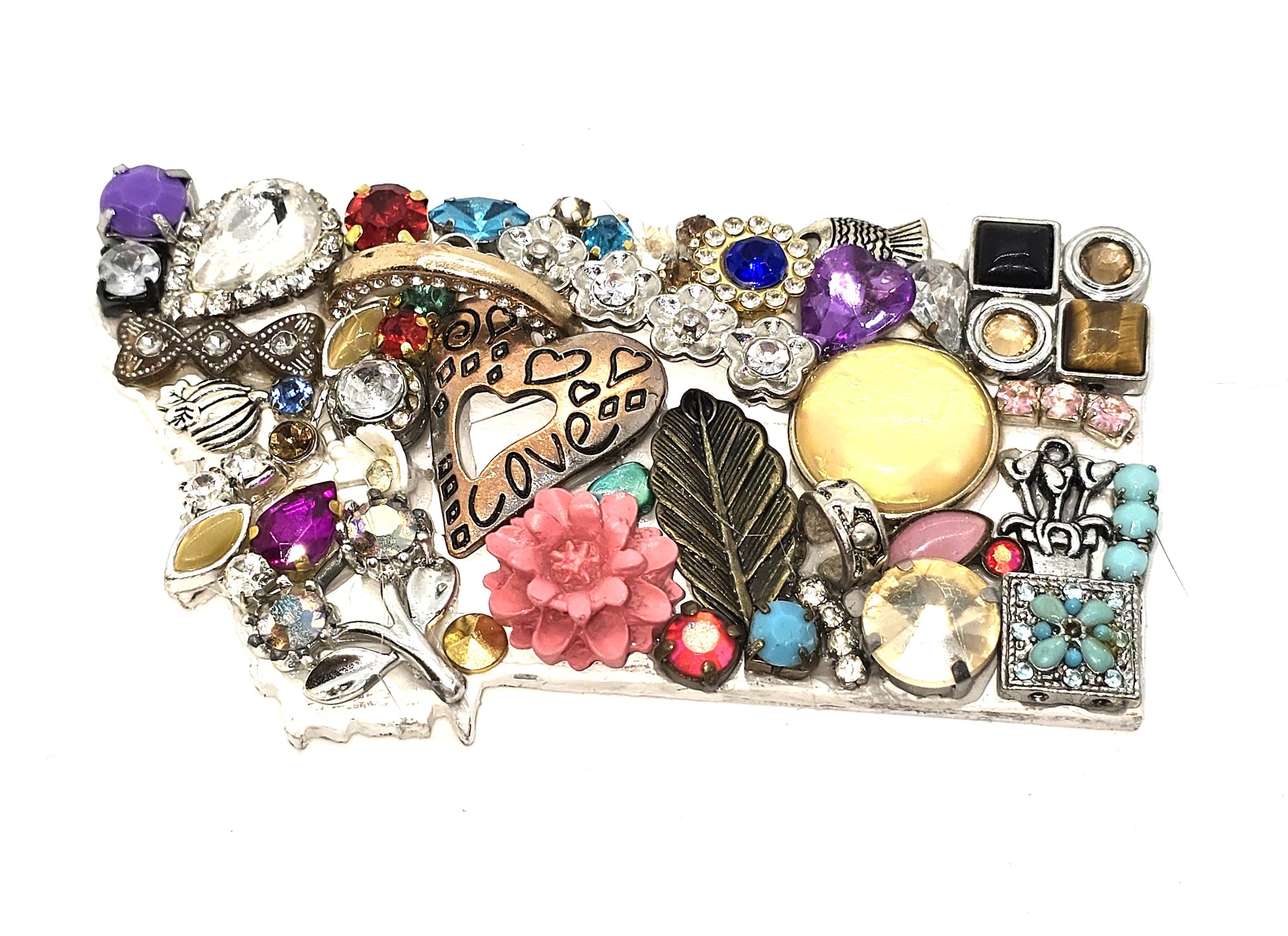 Handcrafted from recycled Materials, 4 inch State of Montana bejewled ornament, large pink flower. copper heart with love. It has stand, Great Gift. Repurposed Jewelry created into a new item. My way of recycling and keeping the items out of the landfill. Great gift for anyone.