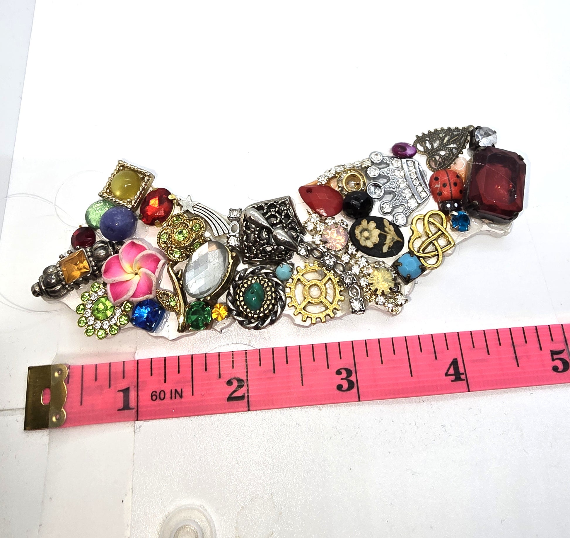 Handcrafted from recycled Materials, 5 inch California bejewled large red gem, pink flower upper left. It has stand, Great Gift. Repurposed Jewelry created into a new item. My way of recycling and keeping the items out of the landfill. Great gift for anyone.