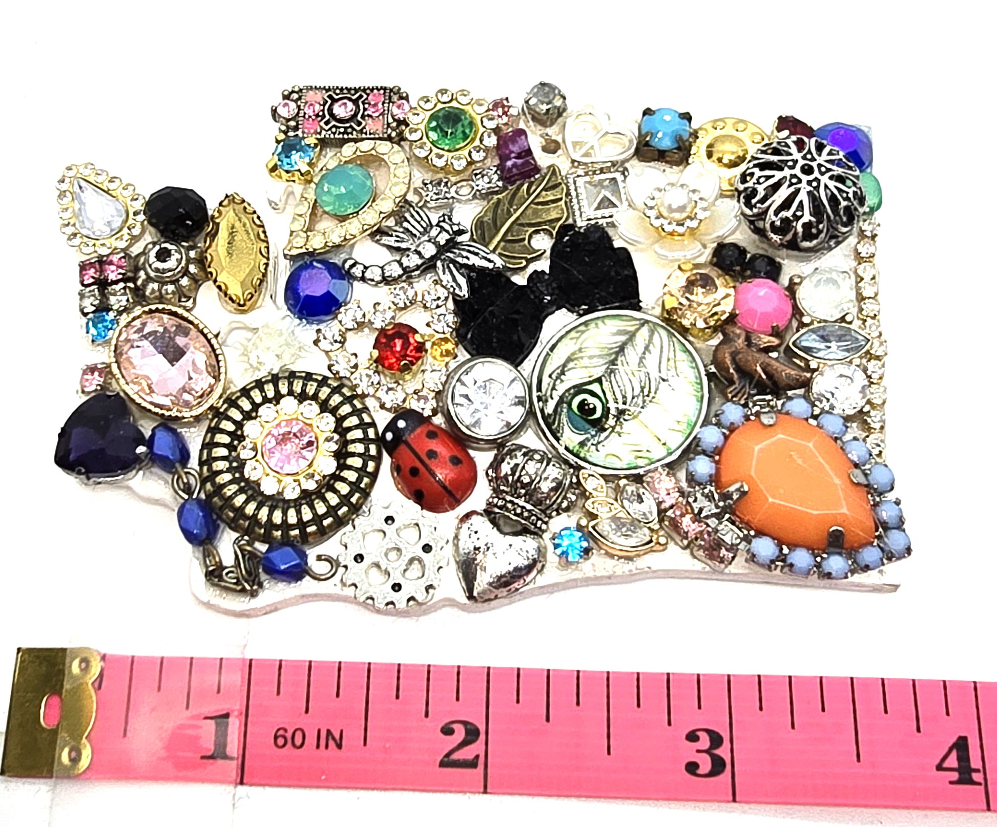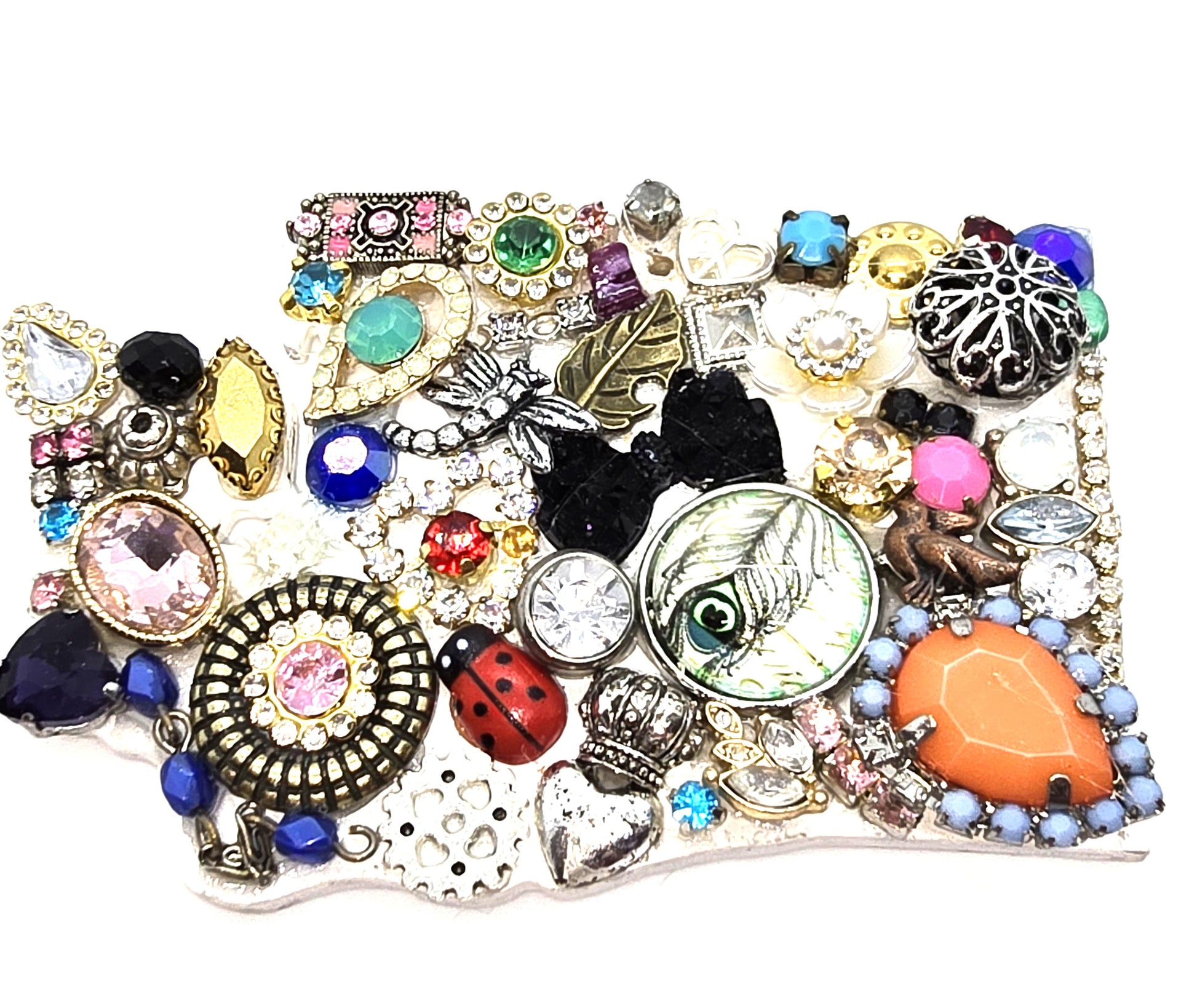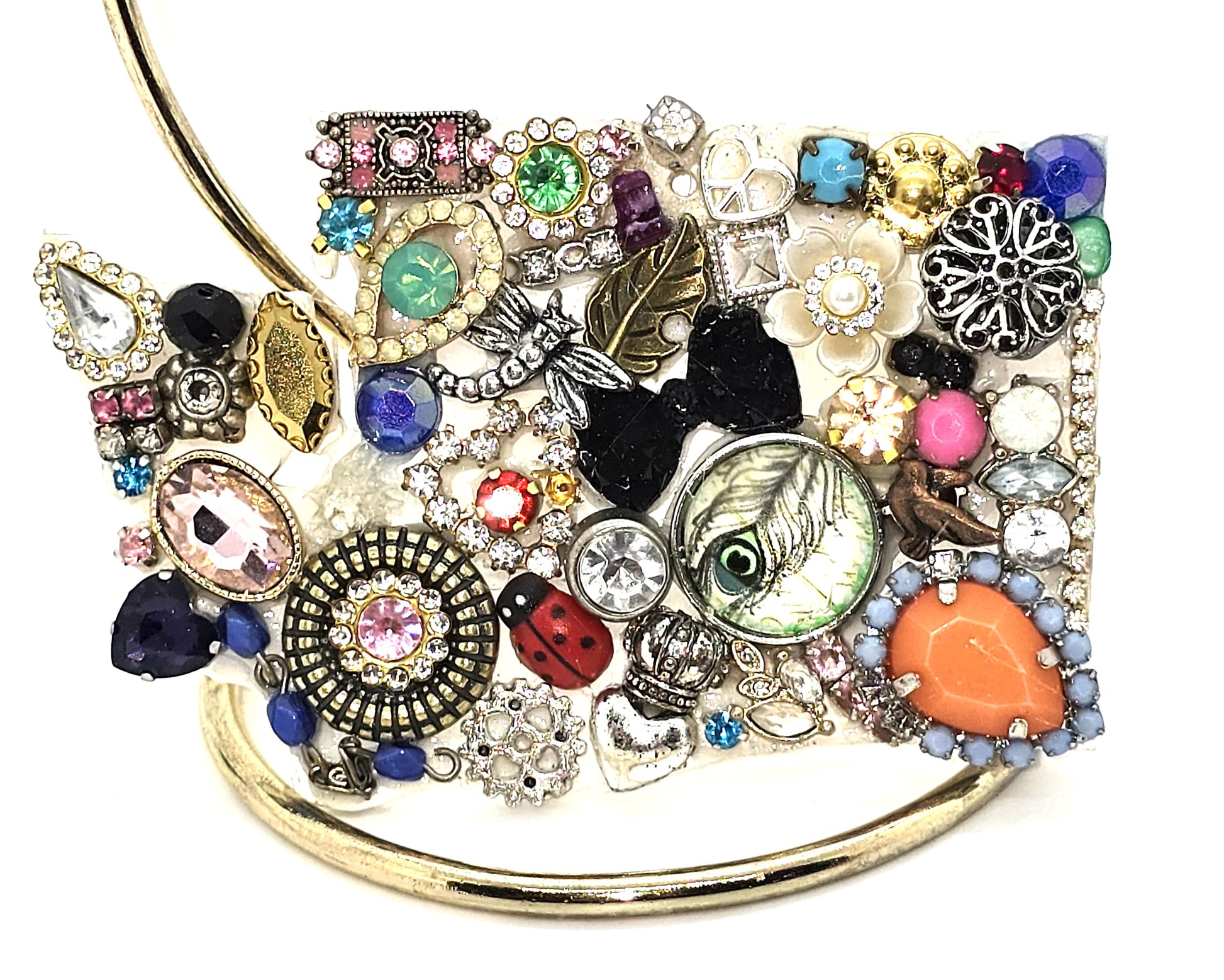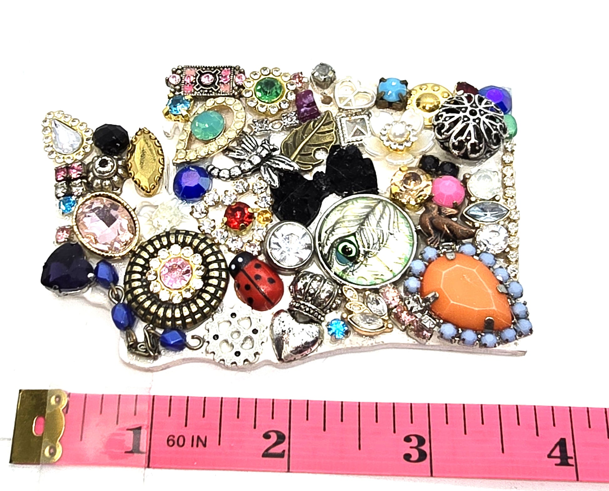 Handcrafted from recycled Materials, The State of Washington Wooden Ornament. There's a ladybug, flowers, dragonfly, jewels all recycled from other items. Bejeweled Idaho is 2.5x4 inches, has stand, Great Gift. Repurposed with Jewelry created into a new item. My way of recycling and keeping the items out of the landfill. Great gift for anyone