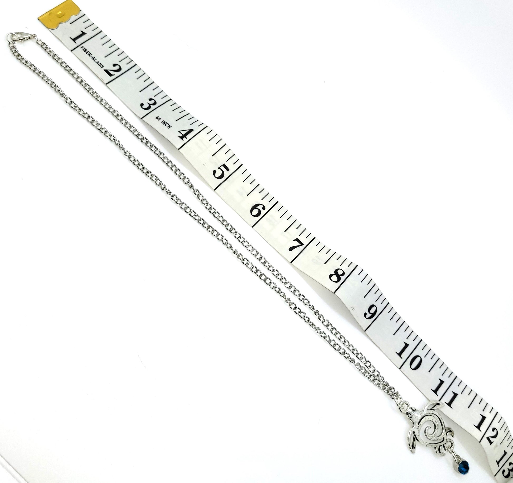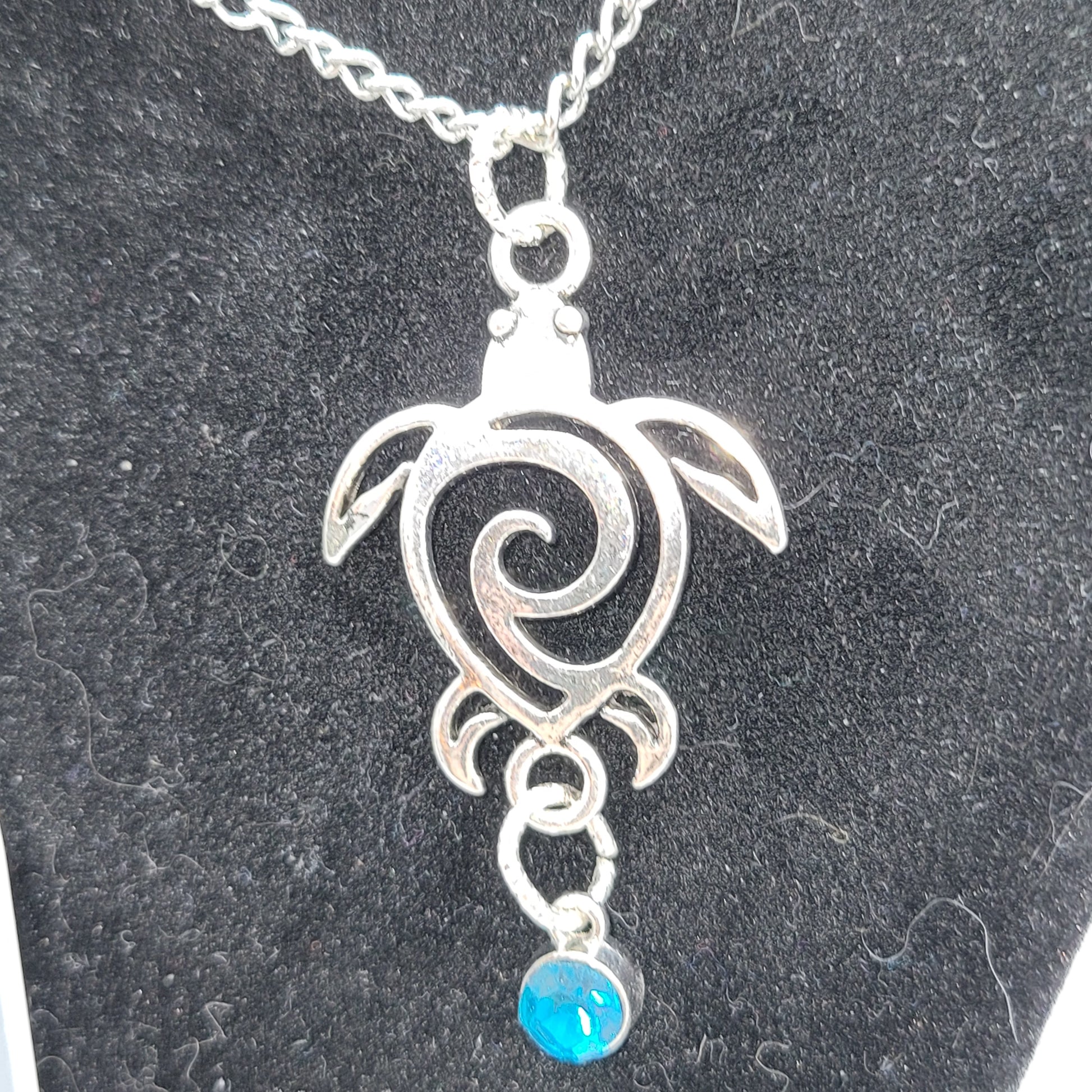 Handcrafted Silver toned Turtle charm necklace & earring with turquoise colored dangle jewel,