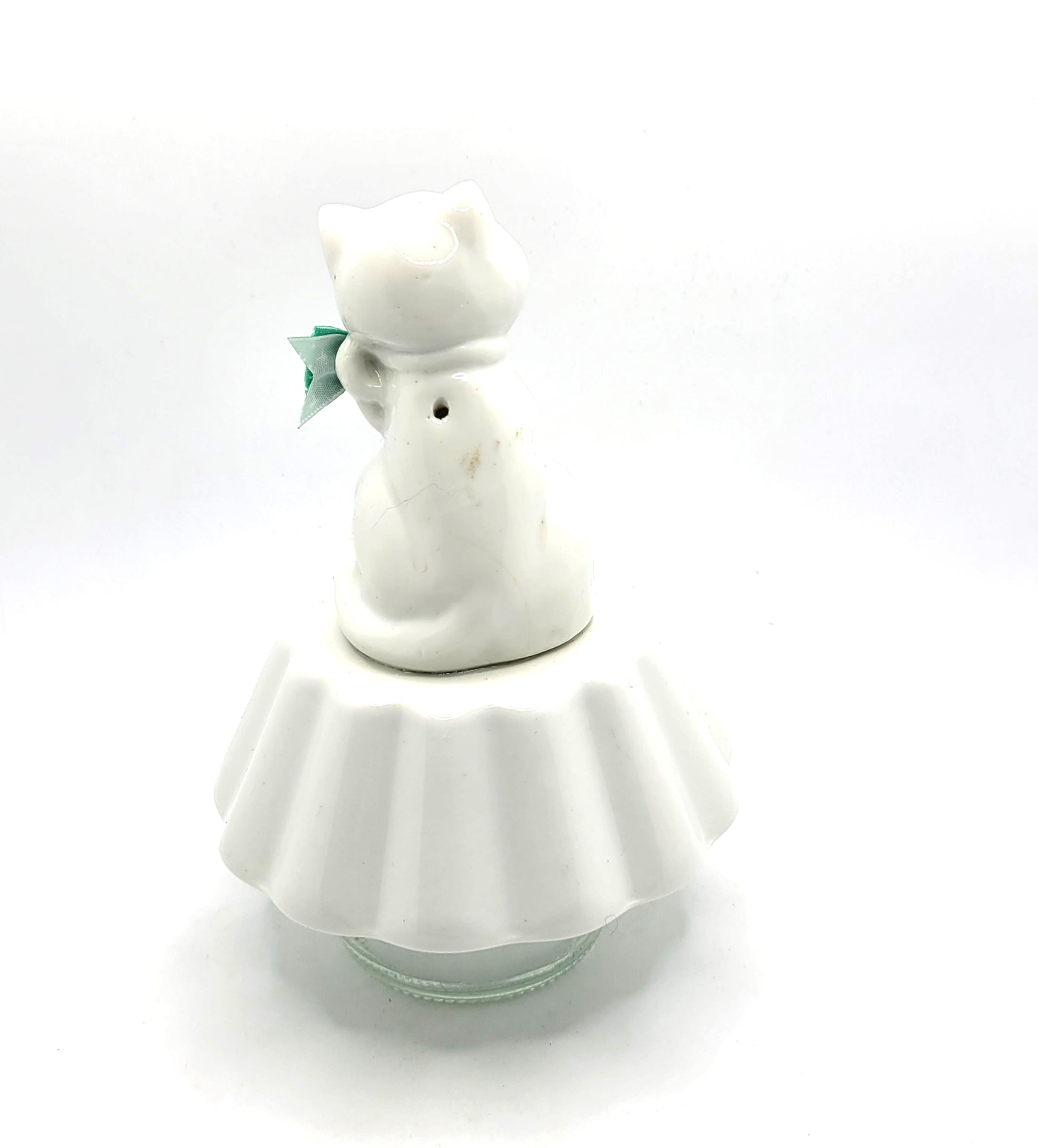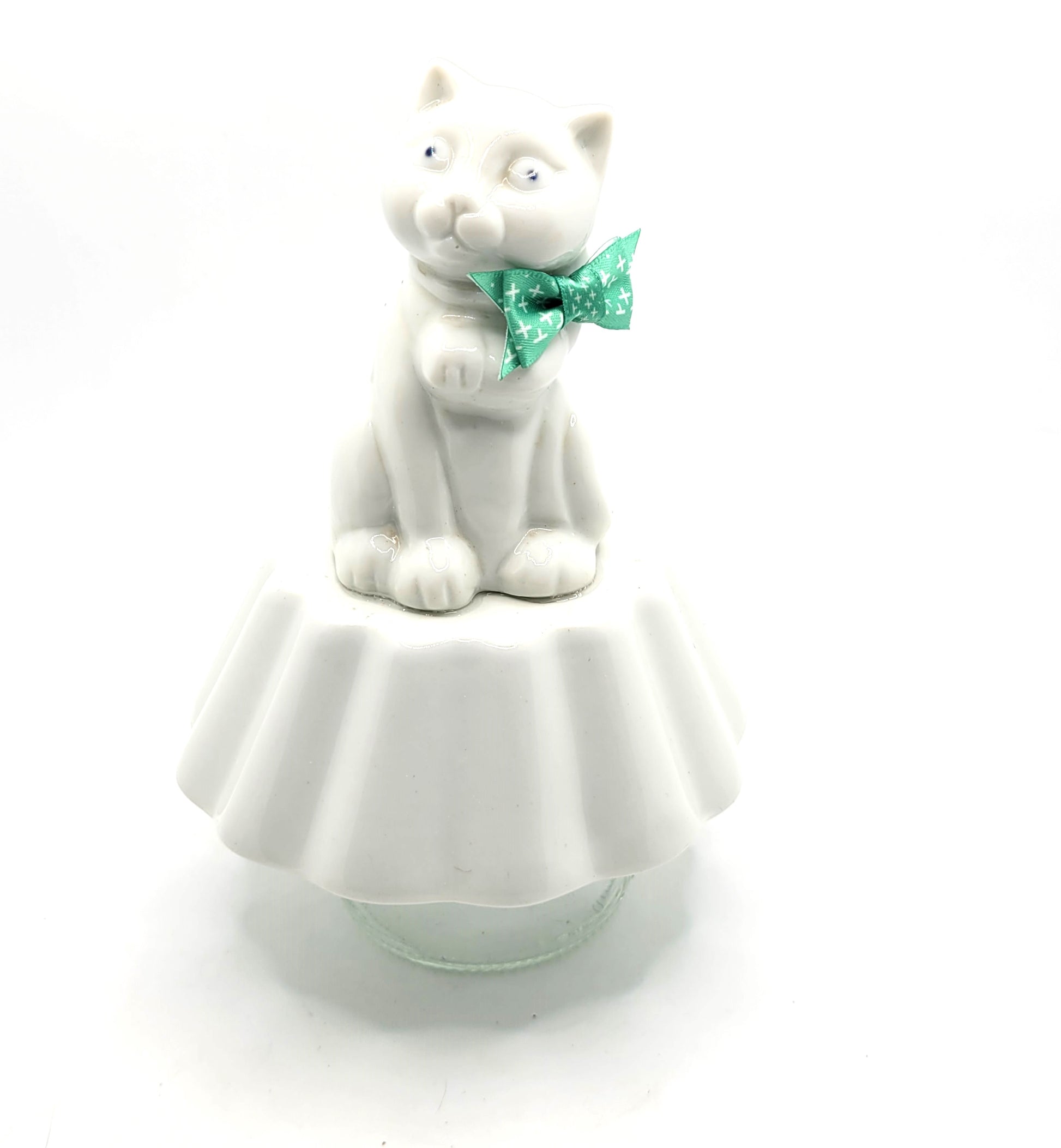 Altered Art Statue Created from Upcycled Materials, Kitty with Green Bow, 6 inches tall.