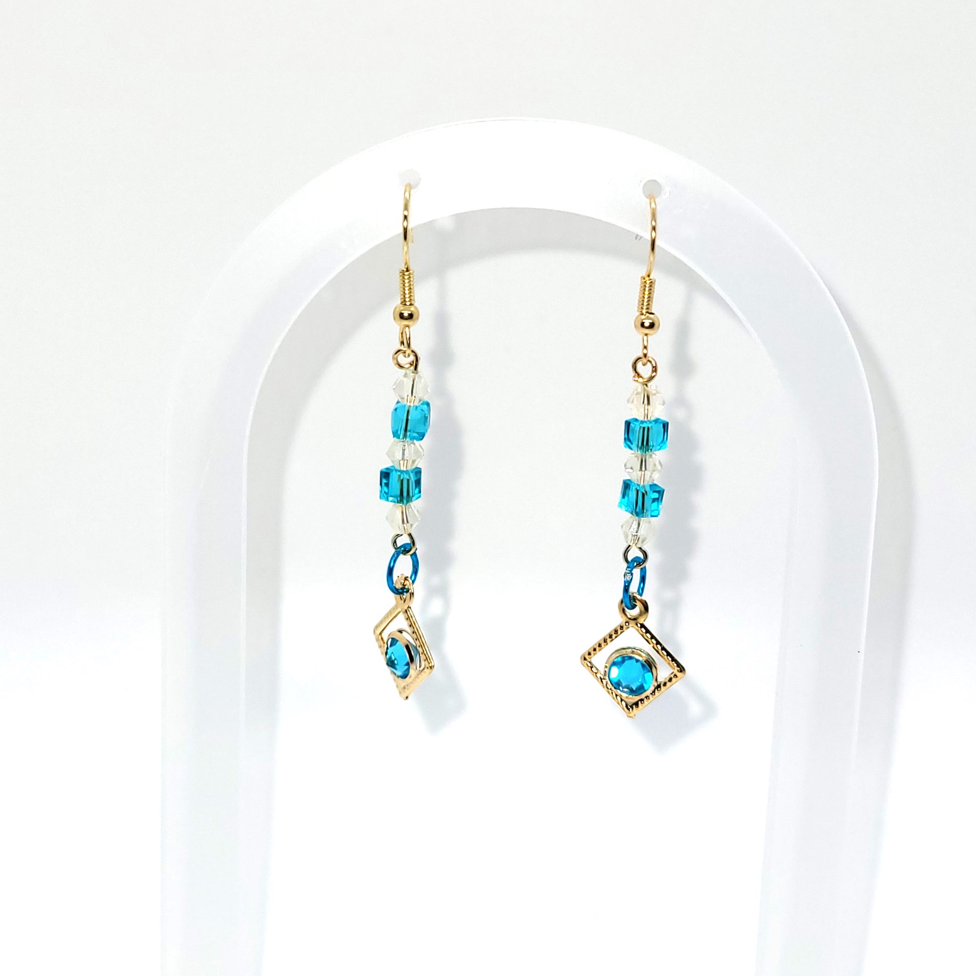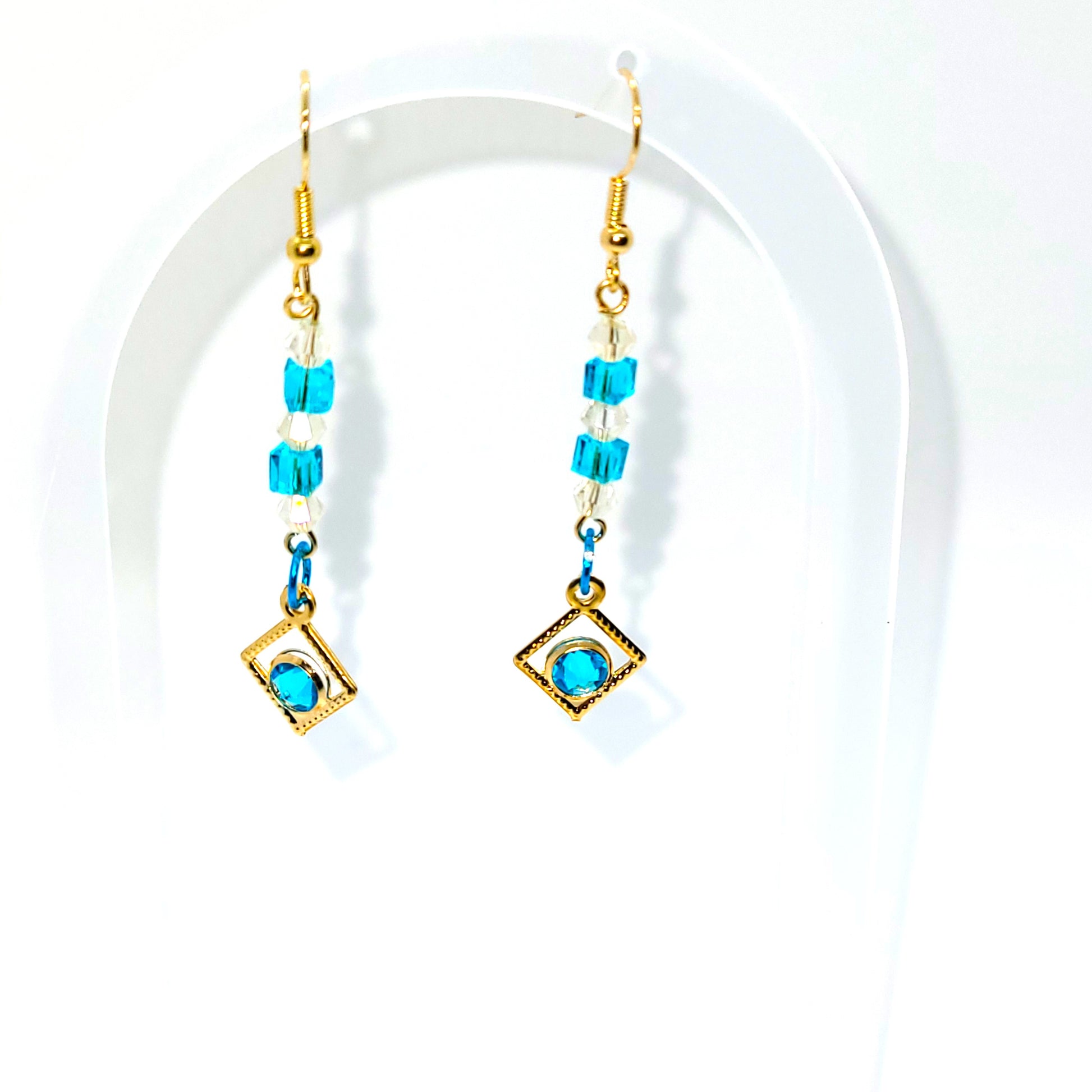 Handcrafted Dangle Earrings, over 2 inches GoldToned, Light Blue & crystal beads. Beads are recycled from other projects to keep from the landfill.